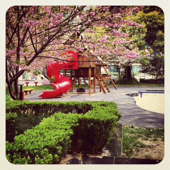 写真はマンション敷地内の小さな公園。八重桜?が咲いてた。