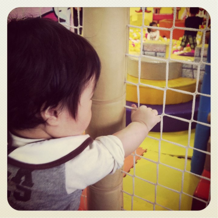 Kはボールプールにいれると号泣したけれど、それ以外は大人しかった。特別積極的に楽しむふうでもなく、お座りしたままきょろきょろしていた。1時間くらいいて、とっくに昼寝の時間に突入していたけれど、刺激が強いのか眠たそうにもしなかった。いっしょに船に乗ったり、車に乗ったり、すいかに乗ったりした。それと、トランポリンのまわりを伝い歩きしていた。