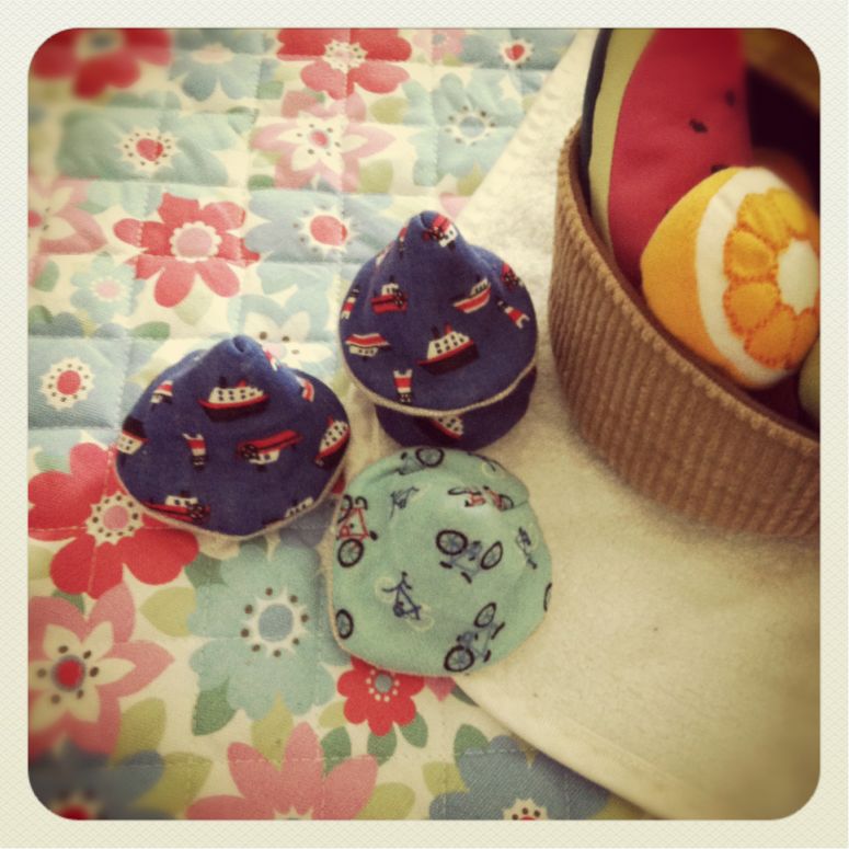 写真:妊娠中に作っていた「おしっこキャップ」。Kが誕生後、一つだけ使ってみたけどやっぱりうまくは使いこなせなくて、今おもちゃになっている。積み重ねたり、猫耳にしてみたり、結構Kも気に入っているみたい。